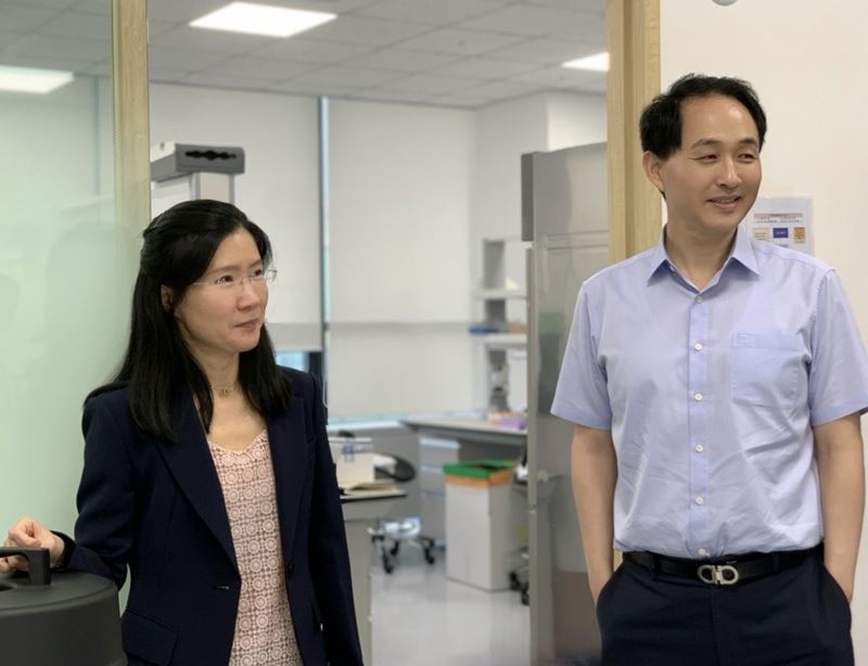 ▲ 연구소에서 줄기세포를 이용해 체외에서 생산한 적혈구인 '바이오블러드'에 대해 설명하는 백은정 대표(왼쪽)와 배경동 이사. 아트블러드