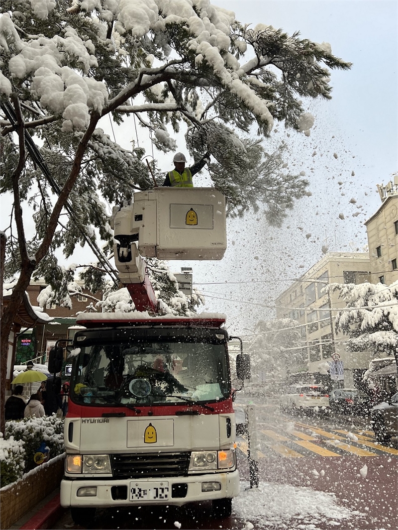 도로, 보도 제설뿐만 아니라 위험 수목의 눈 제거 작업 역시 빼놓을 수 없다. 구는 쌓인 눈으로 가지가 부러지거나 나무가 쓰러질 위험성을 고려해 추가 장비와 인력을 투입해 위험 수목을 별도 관리하고 시민 안전을 지키고 있다.